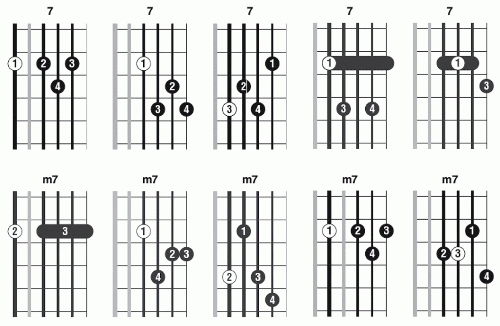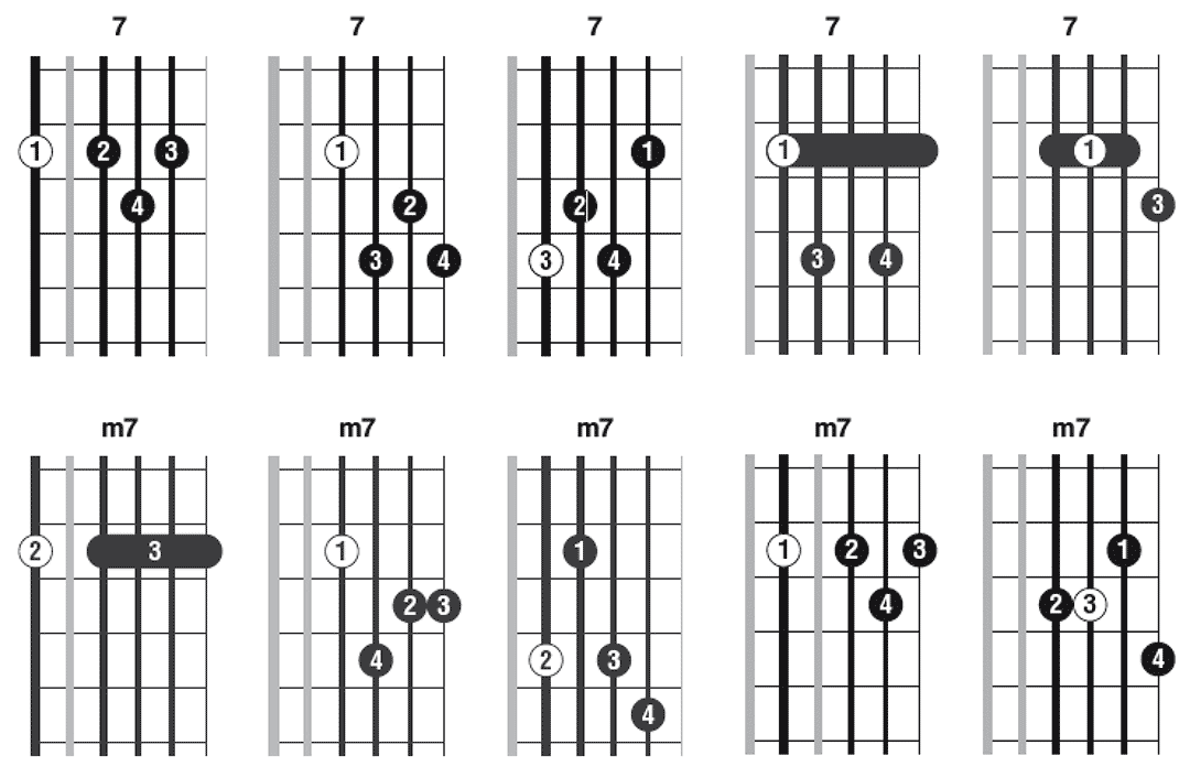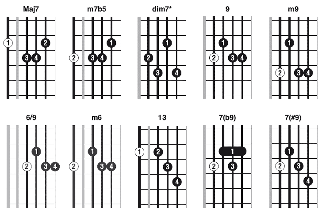 Les accords 7 et m7 étant les plus courants, ils sont ici présentés dans 5 positions différentes. Tous les autres le sont en une seule position… mais il en existe évidemment d’autres ! L’accord dim7 étant un empilement sans fin de tierces mineures, il suffit donc de faire figurer la tonique à l’un des emplacements indiqués pour obtenir un renversement de l’accord.