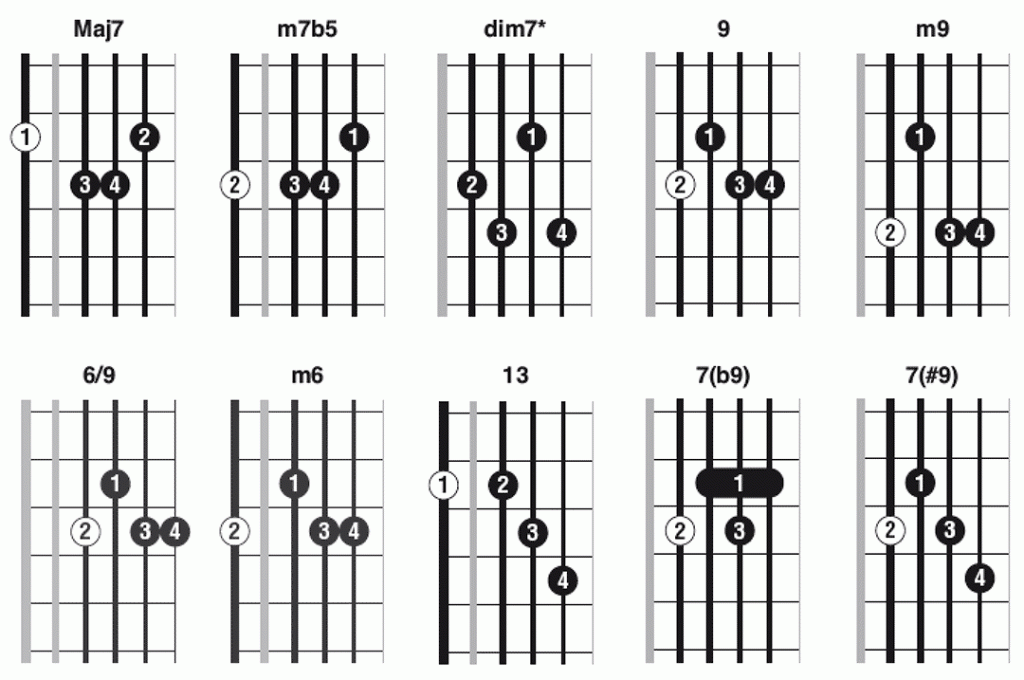 En voici les principales positions (il serait illusoire de prétendre en faire le tour complet), transposables dans la tonalité de votre choix, grâce au repère de la tonique (rond blanc) qui donne son nom à l’accord.